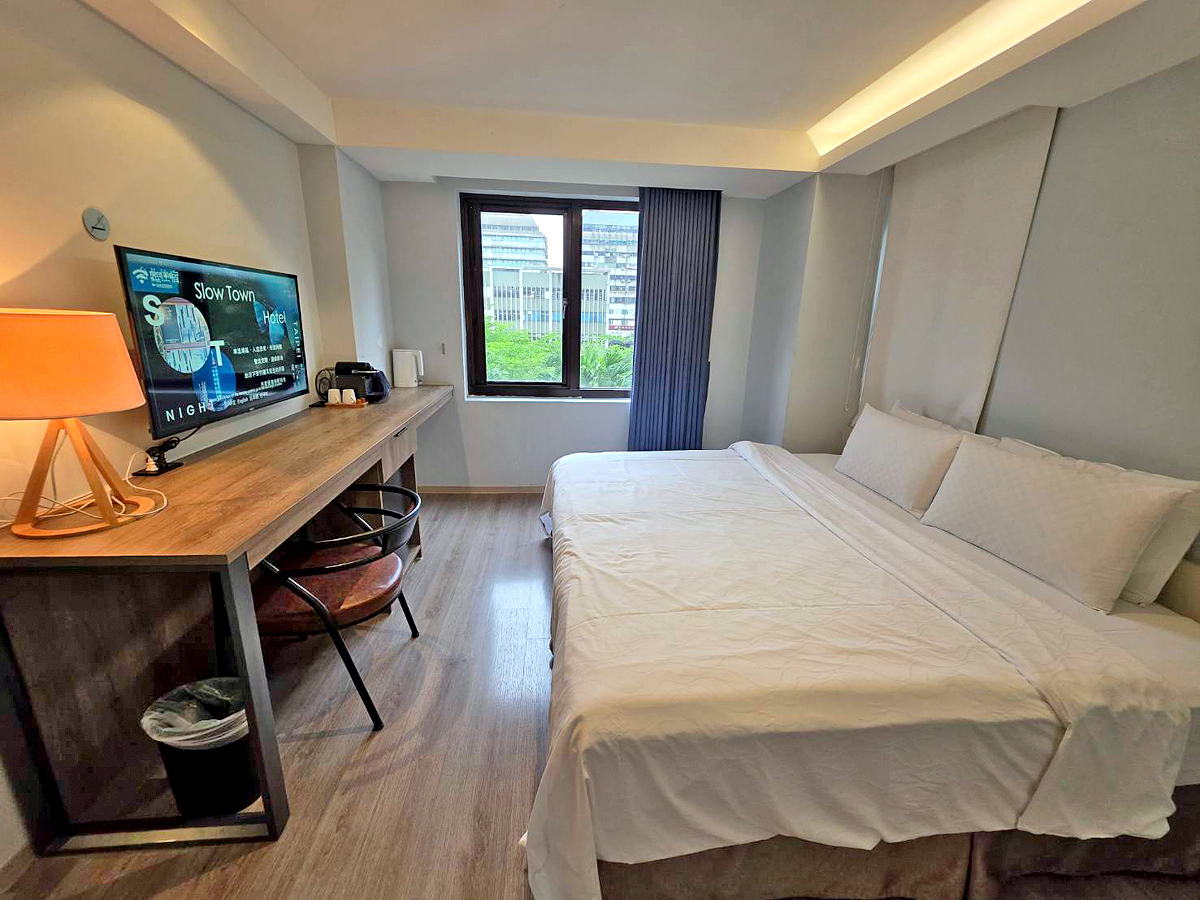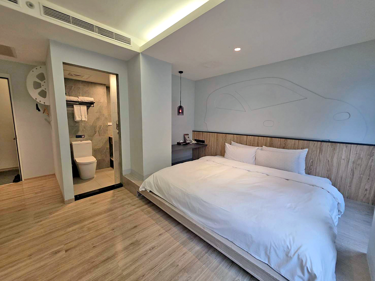 入住的房型有雙人及四人房型,這間是雙人房,房內空間XX坪,配置1大床。