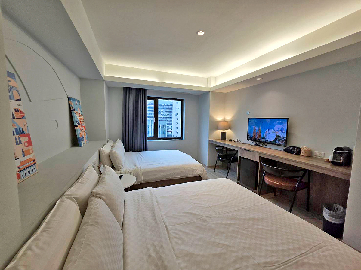 入住的房型有雙人及四人房型,旅幸福的客房以簡約清爽為主軸,木地板舖面不用擔心地毯塵蟎問題;房內除了提供茶包外,還有膠囊咖啡機,讓習慣喝杯咖啡的爸媽出外住宿也能來一杯。