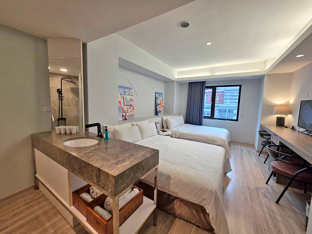 四人房空間XX坪,配置2大床;旅幸福的客房以簡約清爽為主軸,木地板舖面不用擔心地毯塵蟎問題。