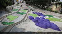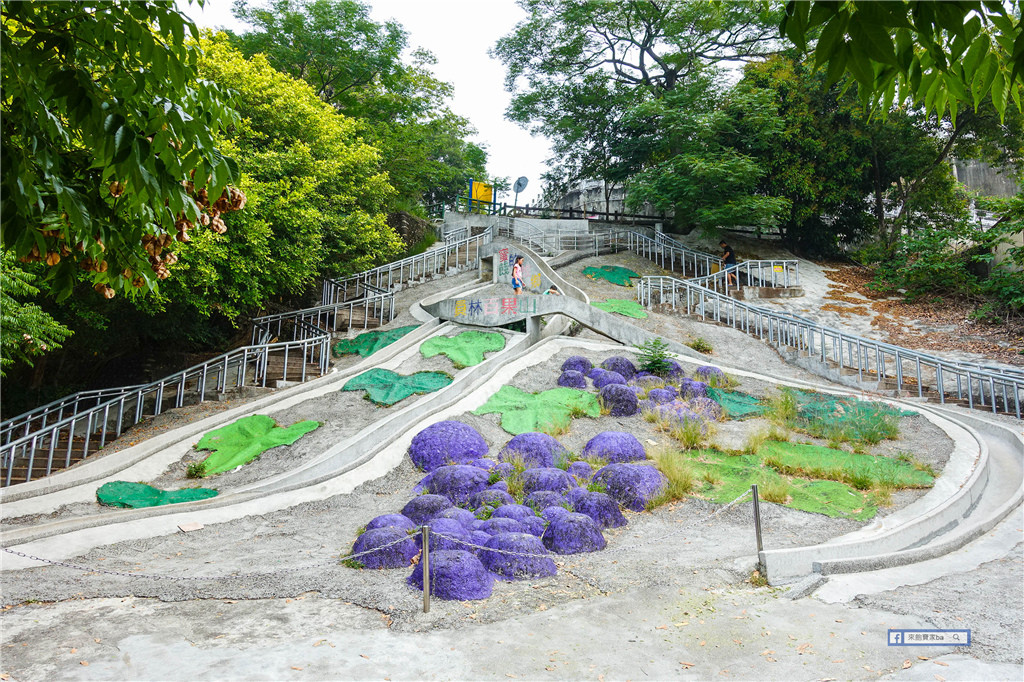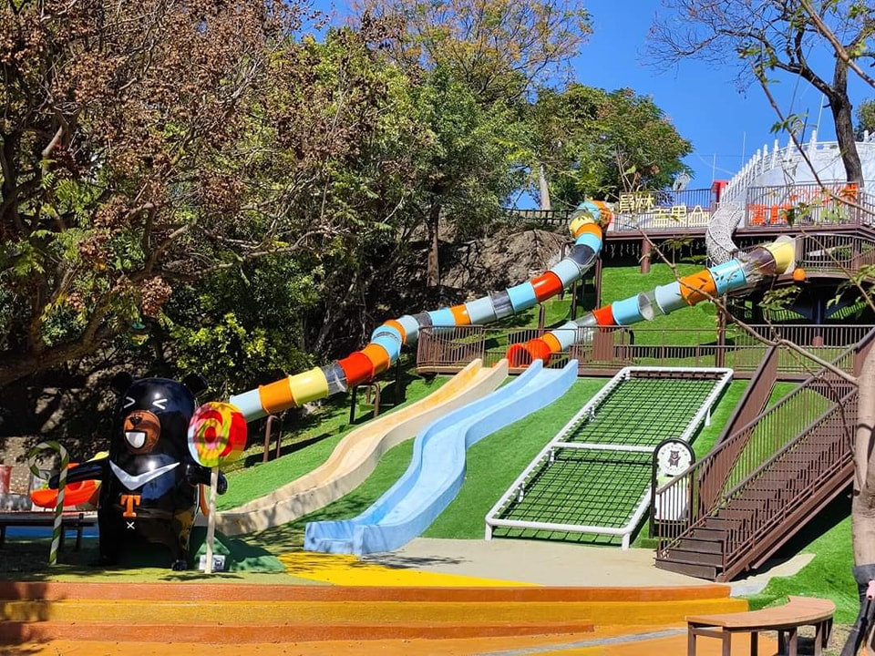全新完工的溜滑梯遊戲區採用人工草皮舖面,保持原有的坡度,設計近26公尺長水管滑梯、2座10公尺長磨石子溜滑梯,並設置攀爬網、鑽籠、攀岩牆、跳樁等遊樂設施,周邊還有2.5公尺高喔熊,以及楊桃、芭樂、荔枝等水果造景,變的更繽紛更歡樂。