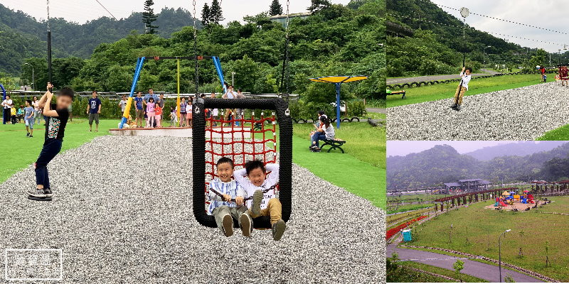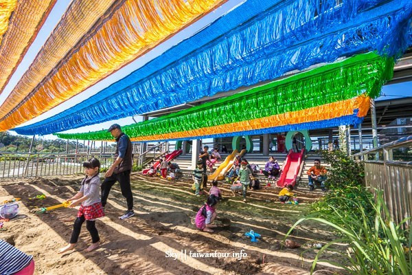 園區非常大,有幾座大型的溜滑梯遊具與大片沙坑,沙坑上方設有遮陽簾擋陽光。2019年4月公園內新增刺激的泰山溜索設施!溜索還分為座椅式與站立式,座椅式設有安全索,小朋友坐著玩更安全。一旁還有鳥巢鞦韆與彈跳床可以玩。