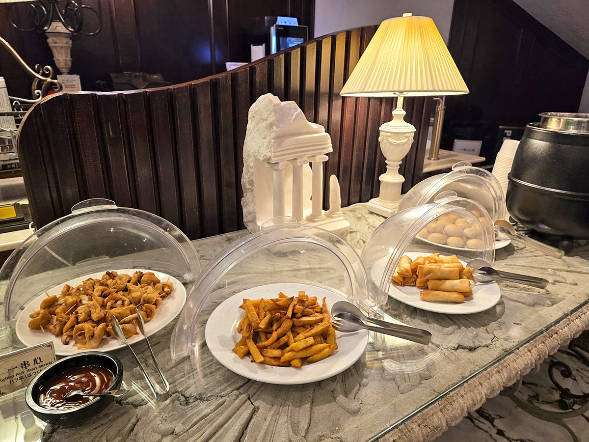 若當日入住人數較少,飯店的早餐則會改以套餐型式供應,自助吧提供果汁、咖啡飲品自取。套餐分為4種類別,第一種「西式」套餐有歐姆蛋、熱狗、三明治、沙拉等。