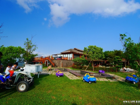 整個整個園區充滿峇里島風情,拍起照來很漂亮,戶外設有盪鞦韆、幾台滑步車讓小朋友玩,還有大型的機械車與人力車可以坐著拍照。
