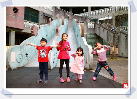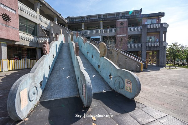 學校最歡迎的是兩層樓高的洗石子溜滑梯,因整座溜滑梯由太陽星星月亮組成,因此別稱「日月星溜滑梯」。溜滑梯滑道呈放射狀,上窄下寬,坡道很長,建議著長褲來滑,以免玩到摩破皮。