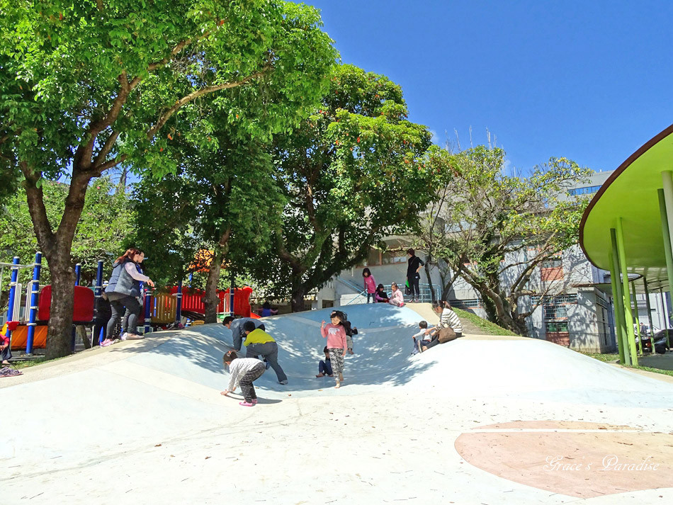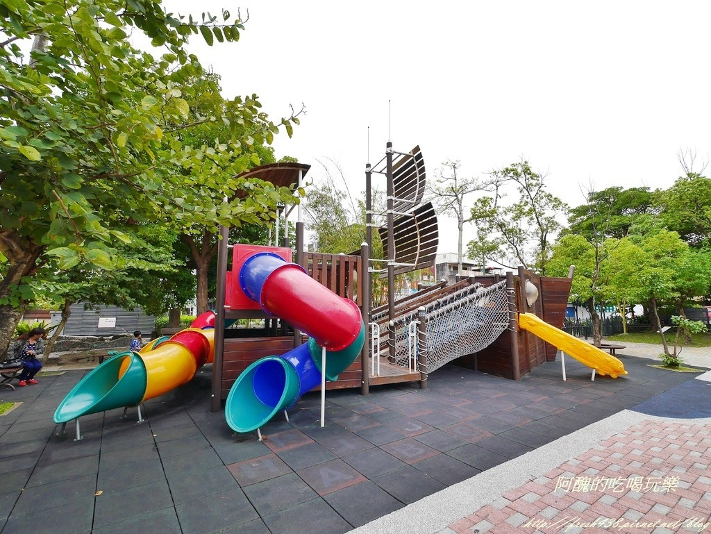 另一個則是木製海盜船溜滑梯,上面設有攀爬設施,滑道是水管式溜滑梯,船首也有適合年齡較小的幼兒溜滑梯,其他還有兩個適合小小孩的造型溜滑梯。2017/04/29再新增碗公溜滑梯!長寬約20公尺的溜滑梯彩結合地景藝術,藍色的海洋、橘色的夕陽,讓玩著溜滑梯的小朋友像在戲水,不只好玩也好拍照。