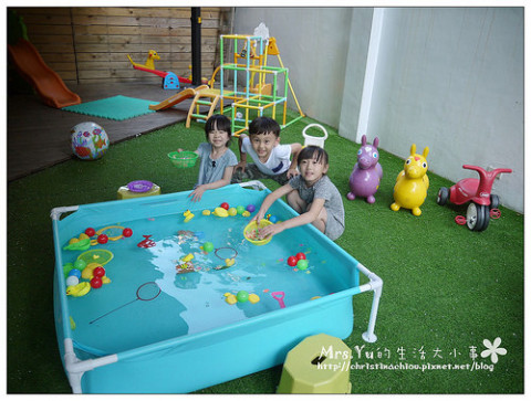 戶外庭園舖上人工草皮,有溜滑梯、蹺蹺板、跳跳馬、滑步車等,小泳池裡面夏天會放水讓小朋友涼快一夏,冬天則改放沙給小朋友玩。
