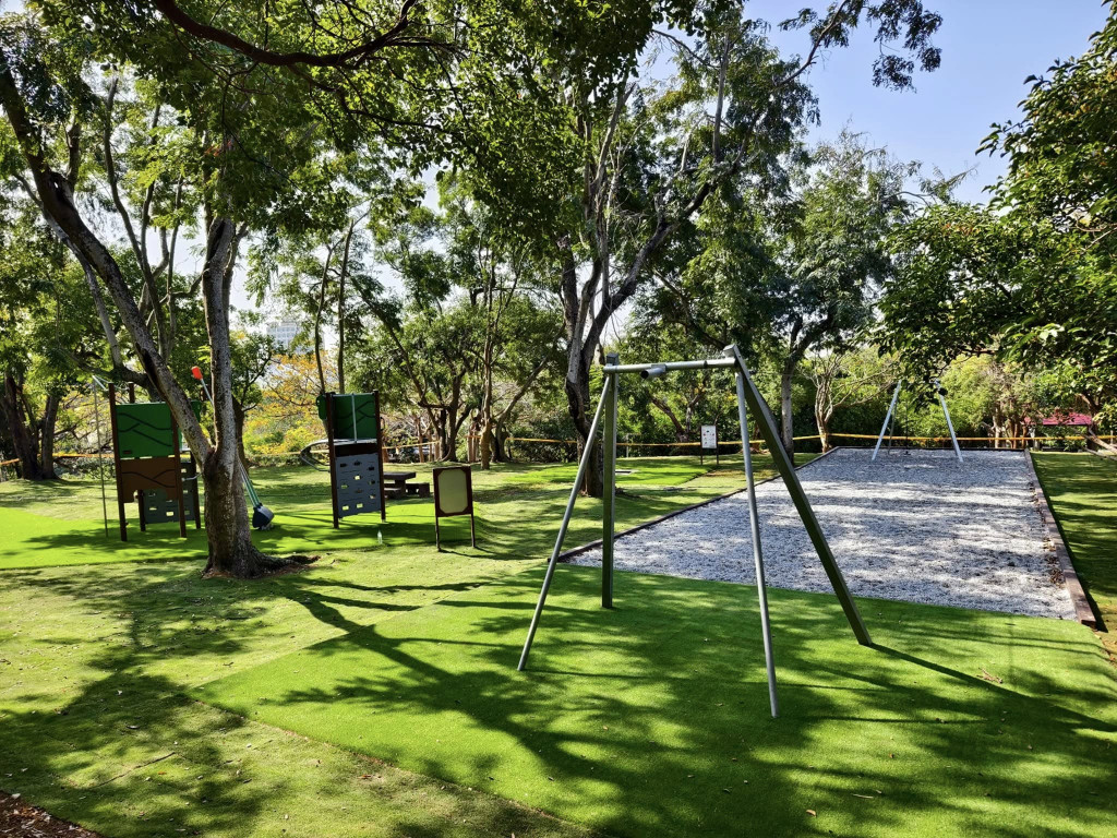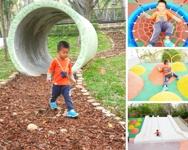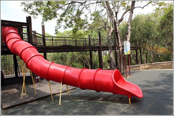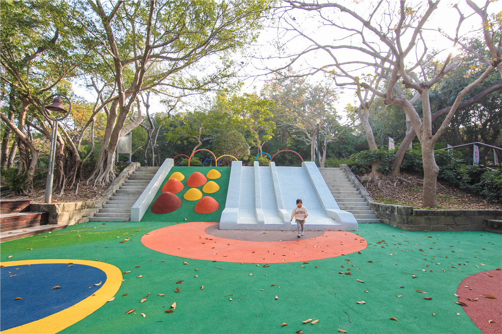 公園內原有大型繩網體能訓練、大沙坑、水管溜滑梯、塑製溜滑梯等遊具,2020年1月打造磨石子溜滑梯、小山丘攀爬、木製平衡木、跳樁、鳥巢鞦韆、彩繪水管躲貓貓等遊樂設施;2025年1月再新增森林溜索、森林攀爬網、泰山空中擺盪、彈跳床、平衡旋轉盤等具挑戰性遊樂設施,讓各個年齡層的小朋友在這裡都能玩的開心。
