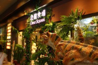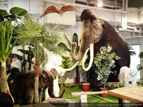 一進門就會看到一個小小兒童遊戲區,適合6歲以下小朋友來玩。用餐區上面則有長達6公尺的中華盜龍化石掛在空中,四週則有很多長毛象、熊、獅子跟鳥等各種布偶做成的等比大型動物吸引小朋友目光。