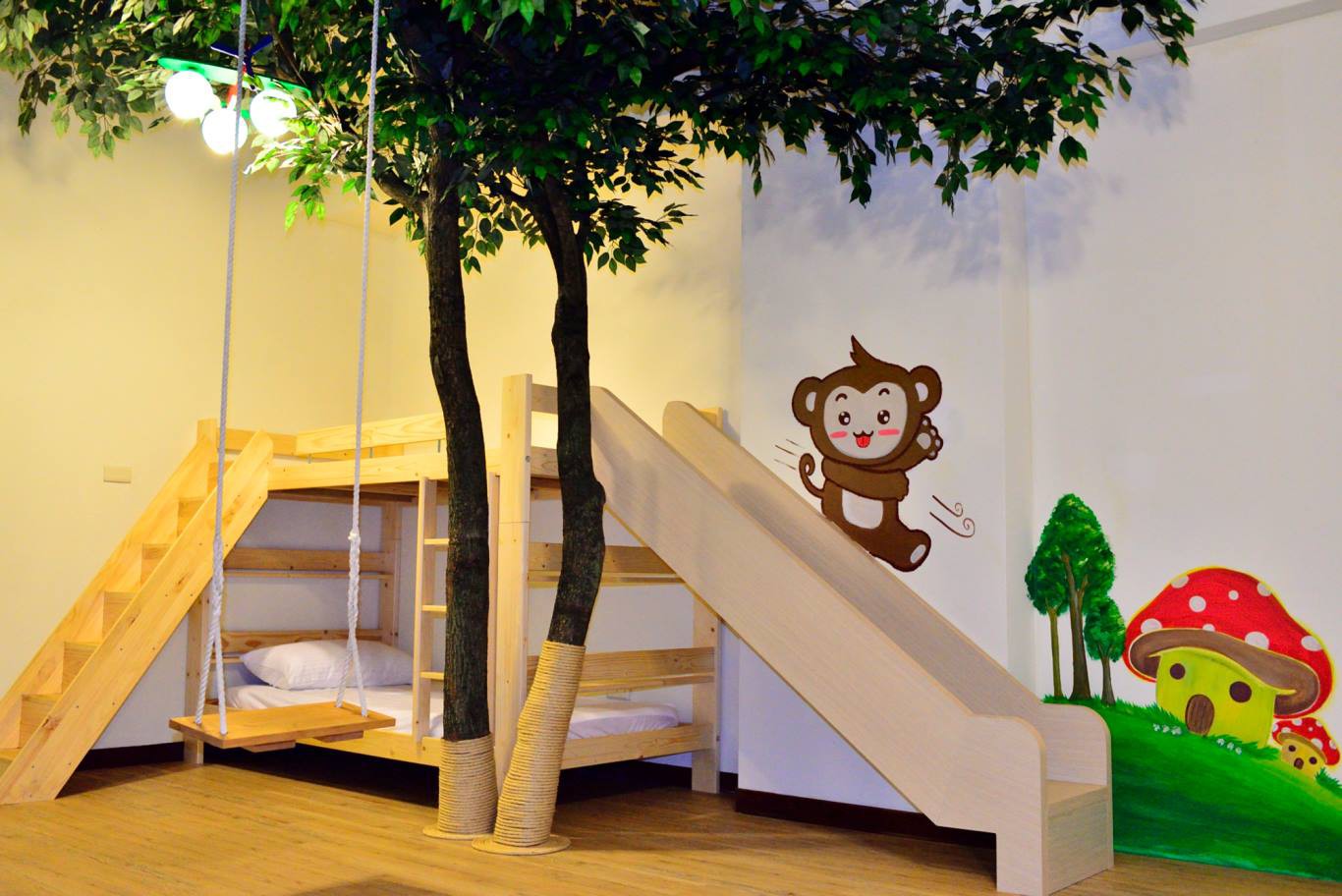民宿有五種房間可選擇,每一間都有溜滑梯讓小朋友可以在住宿的時候玩溜滑梯。而最讚的是叢林房,除了有溜滑梯外,還有盪秋千哦,秋千可承重80公斤,大人也可以玩。且房間還有一顆真的樟樹,可防蚊也能有真的叢林感。