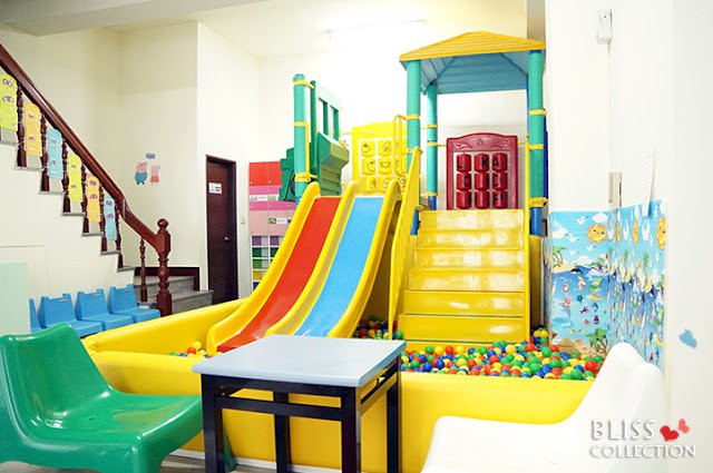 一樓的親子館有大型的溜滑梯加球池,另外還有一個提供白色貝殼沙的沙坑。二樓則有許多的繪本書籍、拼圖、玩具、教具和桌遊等。小朋友愛玩的扮家家廚房組這裡也有準備。牆上大片的白板則適合給小朋友畫畫。