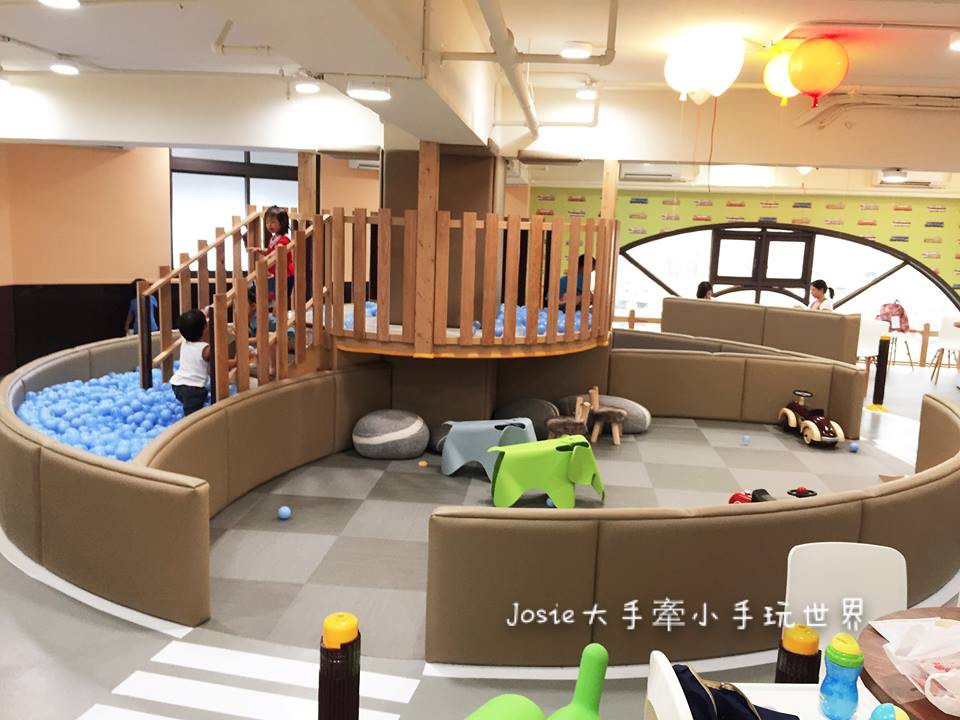 最外圈則是家長的休息座位,提供一些飲料跟像培果等輕食。小朋友玩的區域另外還有扮家家酒的廚具組、閱讀區、大型積木區與決明子沙坑等。因就在火車站旁,在店內也可以觀賞鐵道火車風景哦。