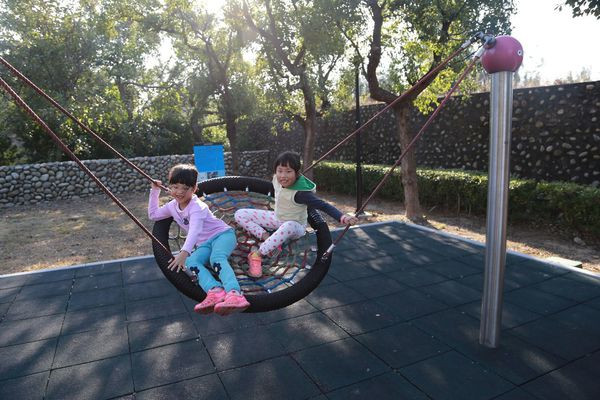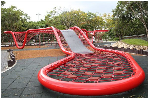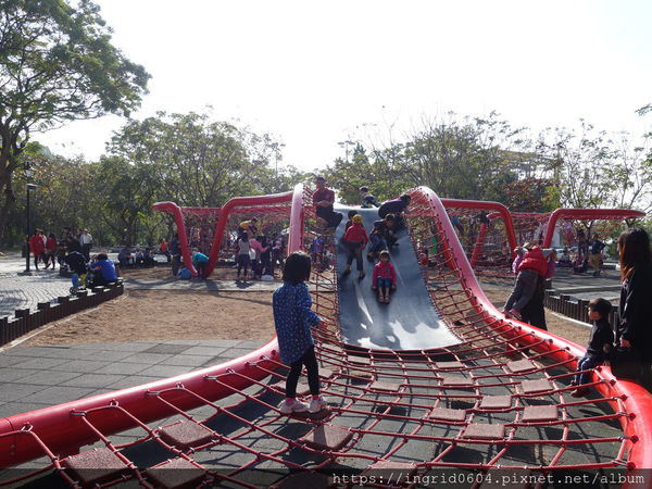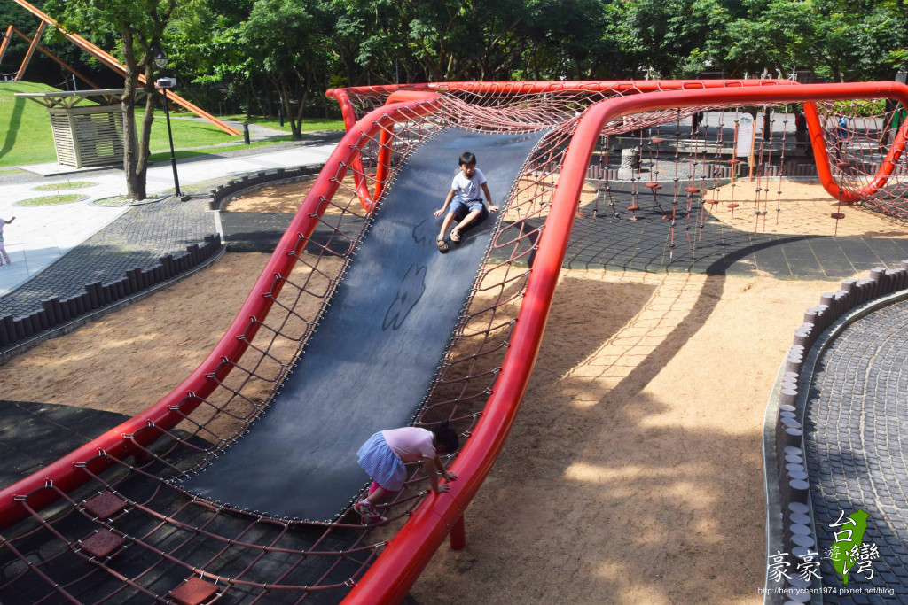 第4區是蜘蛛造型體能攀爬設施,遠看像隻蜘蛛盤踞在小山丘上,小朋友們也像小蜘蛛一樣在網子上爬來又爬去。