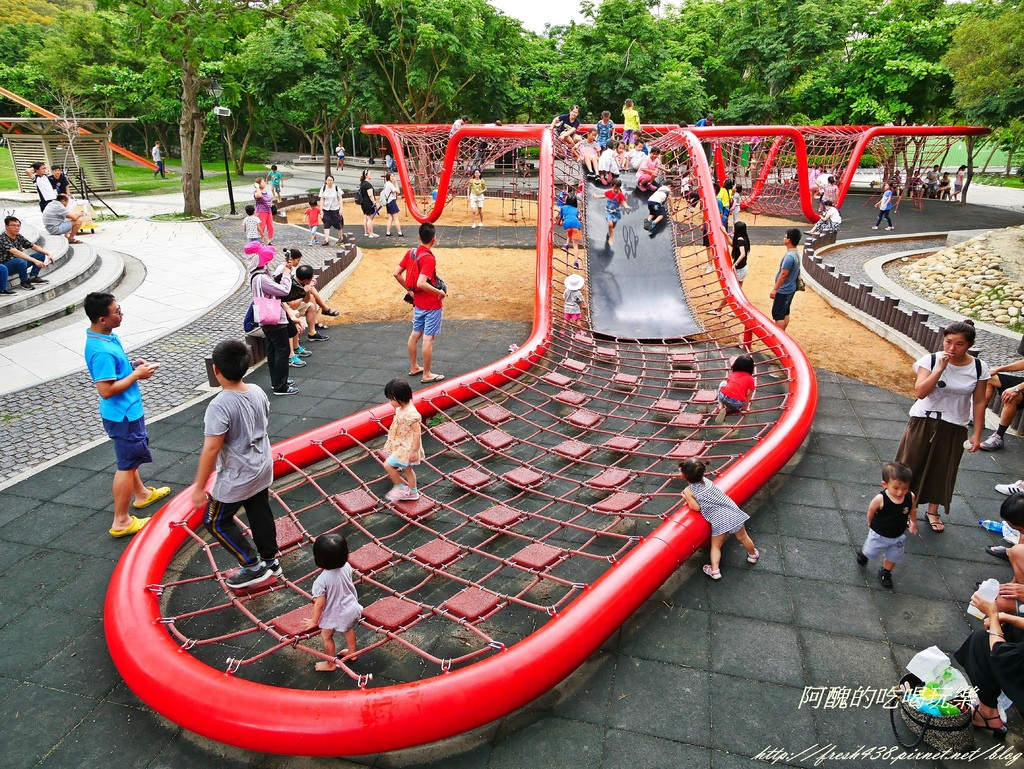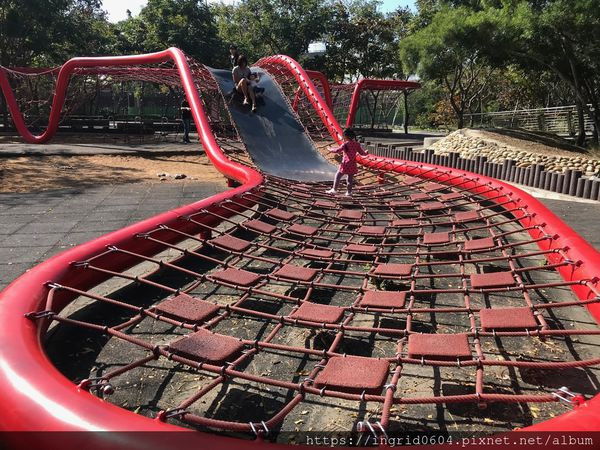 第4區是蜘蛛造型體能攀爬設施,遠看像隻蜘蛛盤踞在小山丘上,小朋友們也像小蜘蛛一樣在網子上爬來又爬去。