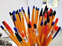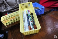 第四堂:DIY做鉛筆,每個人可以拿到三支純白的鉛筆、一支油性簽字筆,桌上有多種圖案的熱膜,選擇喜歡的圖樣套在鉛筆上,然後在空白處畫上你的創意塗鴨,最後拿給導覽人員烘烤就完成嘍。