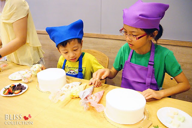 潭子店的蛋糕是提供已抺好奶油霜的6吋蛋糕體,配料有水果、巧克力、多色棉花和各色鮮奶油,交由小朋友為蛋糕設計屬於自己的裝飾。因為不需自己組合蛋糕體,操作上較不複雜,所以也適合小小孩參加哦。
