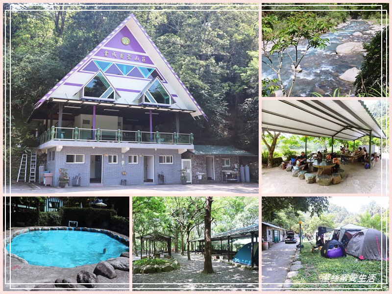 金成露營渡假山莊位於苗栗縣南庄,營區分有棚架水泥營位與水岸露天草地營位。這裡非常寬廣,有不少遊樂設施,有藍球場、羽球場、戲水池(冬天可溜直排輪),還有魚池可餵魚。營區旁有溪流,景色優美,天氣好時也可帶小朋友去玩水。