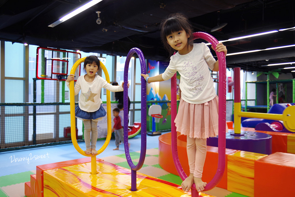 館內分為二區,一個是2-8歲兒童體能區,另一個是0-2歲幼兒遊戲區。二區皆為開放式空間,兒童體能區有障礙氣墊、溜滑梯球池、攀爬區、拳擊區,其他有跳跳馬、籃球框、蹺蹺板,還有彩色大滾輪與大花球,輕鬆消耗小朋友大量的體能。