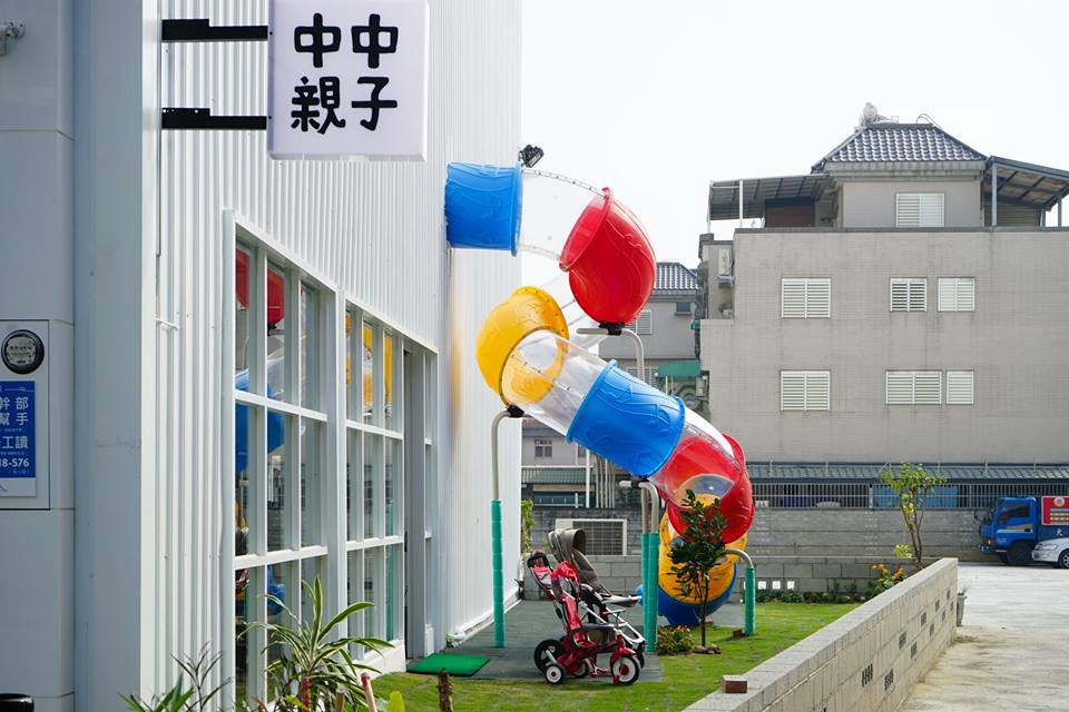 外牆有隻可愛大恐龍的中中親子樂園,很難讓人錯過。遊戲區有廚房組、玩具車、繪本、小球池、各式益智玩具...等。最讓小朋友興奮的就是由這裡溜出戶外的溜滑梯,可以反覆溜很多次。