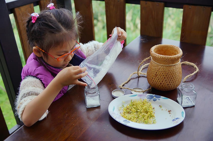 每年的9-4月是桂花產季,這個時節還可以預約DIY讓小朋友動手做桂花釀(需事先預約),由親手採桂花開始,將採收好的桂花加上冰糖封存好,約3-4個月後就是清甜的桂花釀了。
