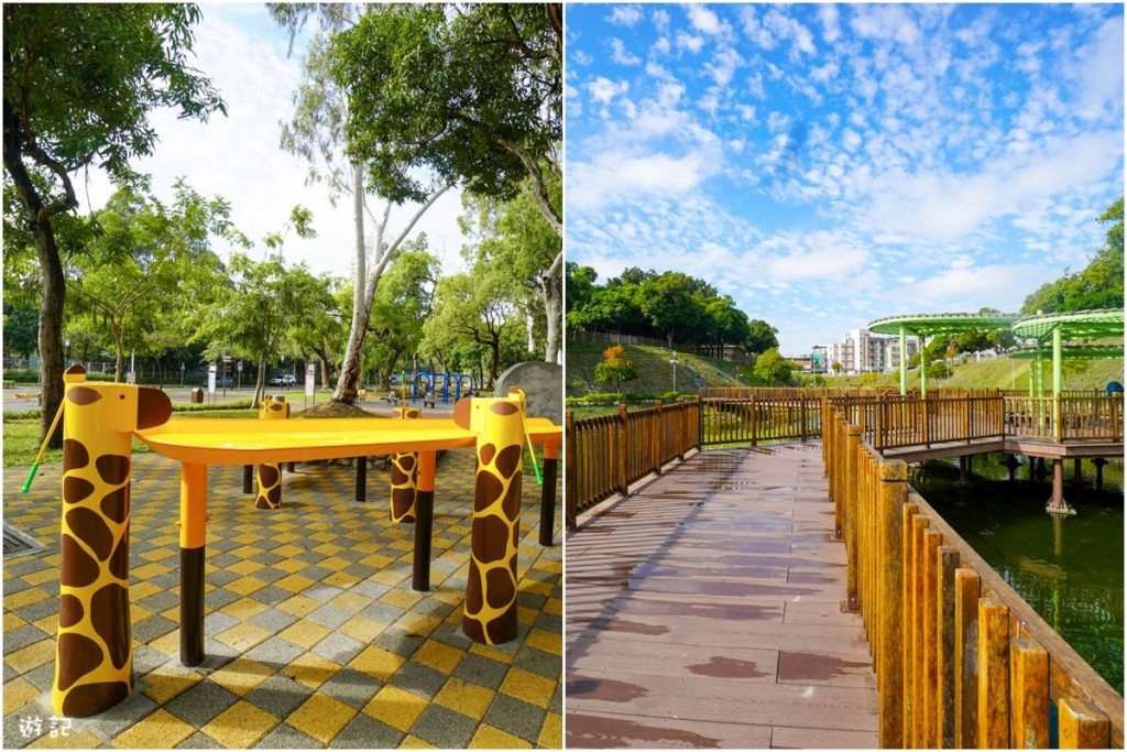 遊戲區有二座大型溜滑梯、盪鞦韆、搖搖椅、蹺蹺板,屬於大人的健身器材也不少。2020/12/23遊戲區旁再打造可愛的水利小公園,以水互動為主題,設計水道互動合作、流水聲音體感、樹林探險體能3區,小朋友可以踩踏水車、按壓長頸鹿造型汲水器、水畫牆塗鴉。樹林探險則是礫石鋪面的平衡體健設施,找機會帶小朋友來體驗不同的遊樂設施。