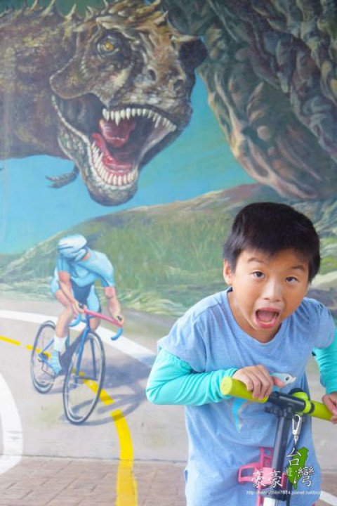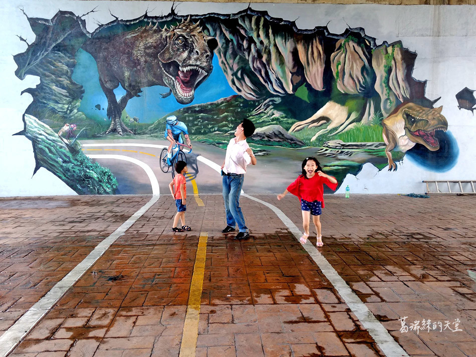 地點就在華中橋下方的「恐龍公園」,將牆面彩繪成3D立體恐龍造型,每隻恐龍仿如要跳出來,非常適合帶相機來拍照。且公園還設計了許多隻跟人等高的大型可愛恐龍,從空中垂降的恐龍等,方便大家取景拍照。