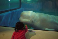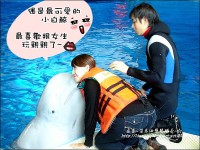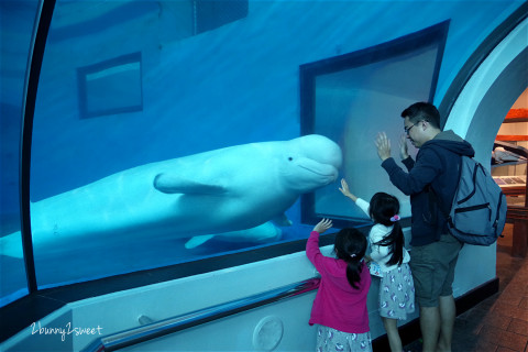 後方的壓軸就是萌萌的小白鯨,一下子轉圈圈、一下子玩遊戲,可愛的模樣極具療癒效果,有時還會游到遊客前方與大家互動。