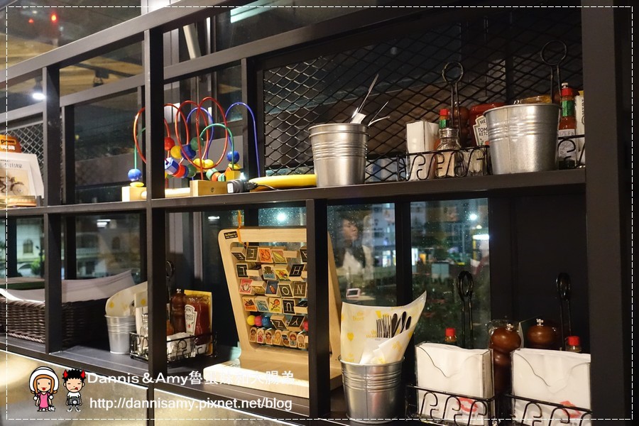 餐廳有二層樓,裝潢走工業風,座位有分一般座位區與沙發座位區。玩具、畫紙...等就放在二樓的架子上,讓小朋友自由拿取。