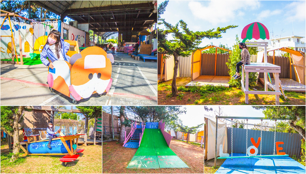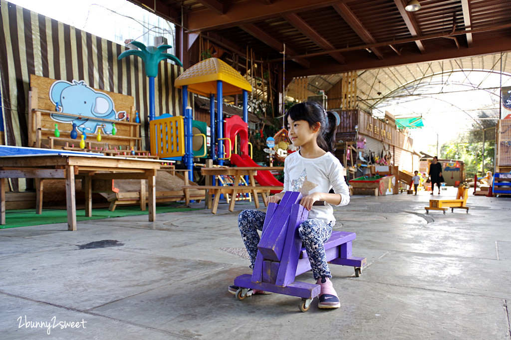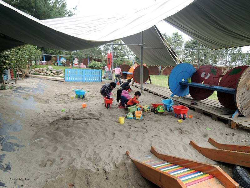 兒童遊戲區屬半戶外,開放式的空間有屋簷,下雨天也不用擔心,這裡有溜滑梯、木製嚕嚕車、大型彈珠台、射橡皮筋、木製手足球台、巨型滾珠迷宮、攀岩溜滑梯沙坑、彈跳床,戶外還有盪鞦韆、蹺蹺板、籃球王、人力拉車大片草皮,可以讓小朋友盡情跑跳。