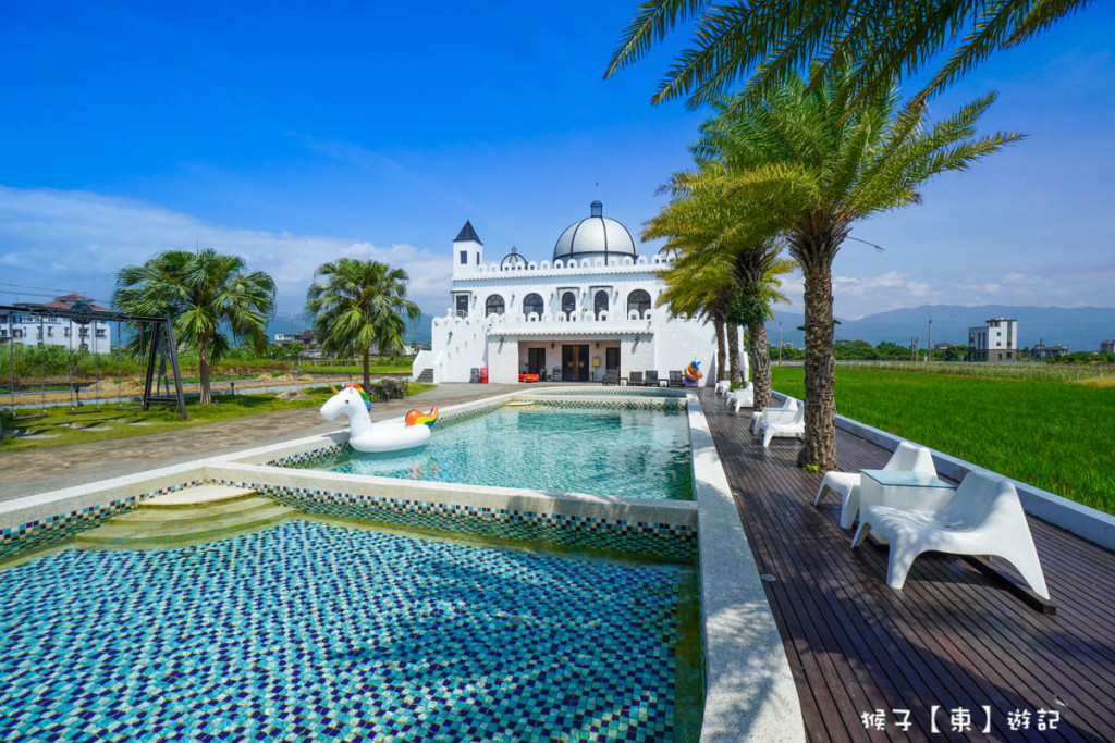 二棟別墅中間有深淺二池游泳池,一旁還有盪鞦韆。民宿提供多樣可愛造型浮具,大人小孩一起開心戲水。
