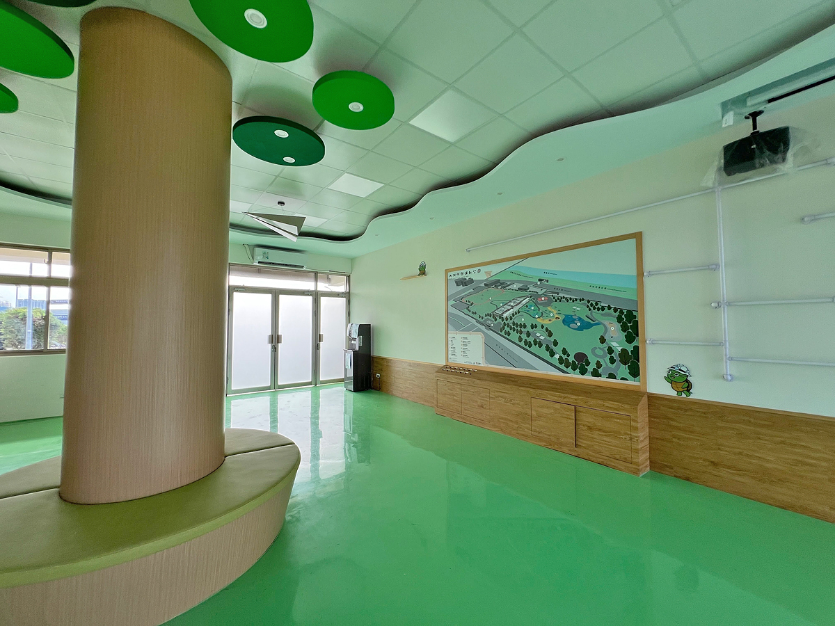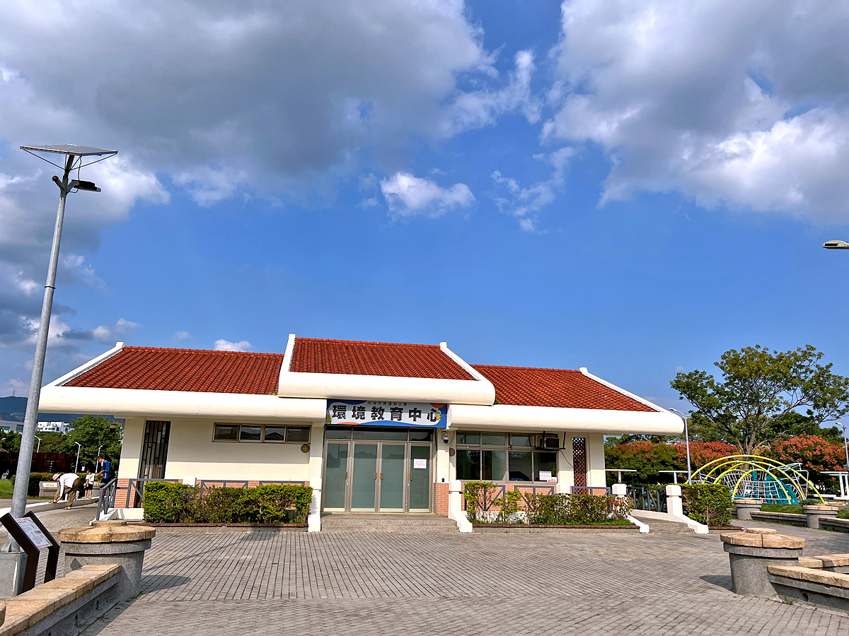 兒童遊戲場前有一棟環境教育中心。