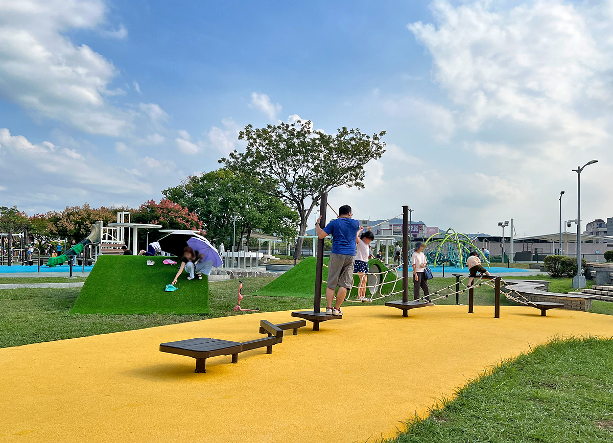 公園遊戲場與極限運動場在2025年10月完成大更新,依照兒童年齡層打造4個遊戲區,有適合小小孩的攀爬滑梯與戲沙坑、中大童的闖關攀爬區,以及大童的原木攀爬架;其它還有彈跳床、小山丘、傳聲桶、躲貓貓涵洞等遊樂設施可以玩。