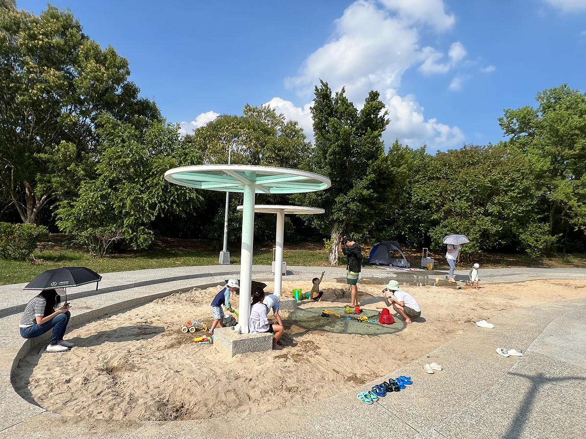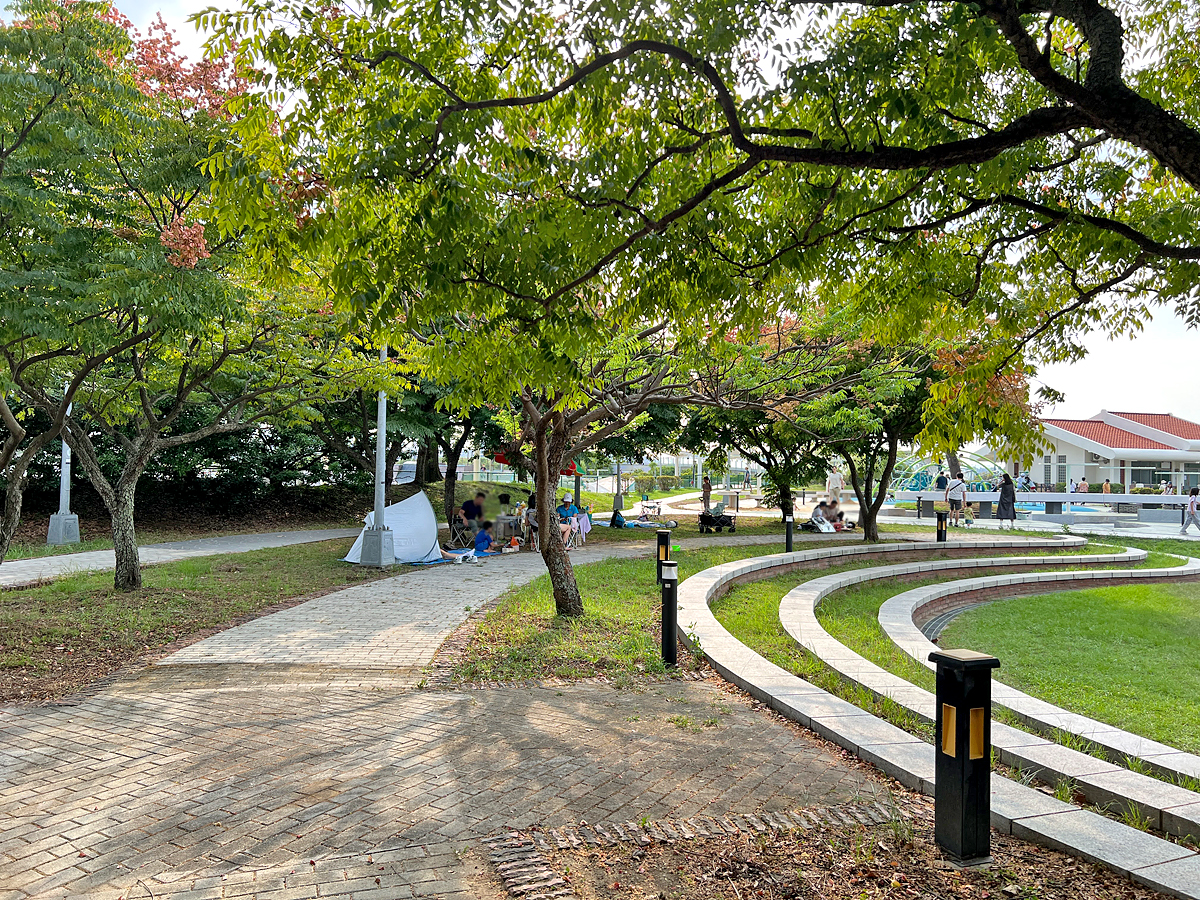 周邊種植不少樹木,許多家庭會在樹下擺放小帳篷或野餐墊,氣氛悠閒舒適。