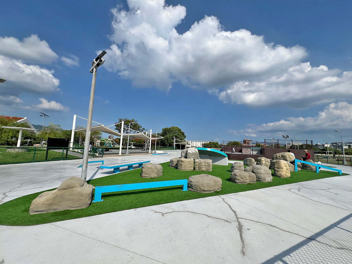 可以練滑板、直排輪,也有仿大石頭的跑酷區。