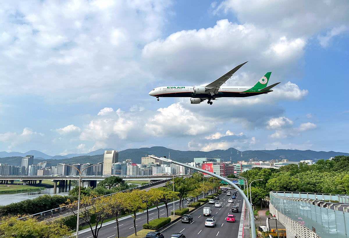 前方正對著松山機場跑道,可以清楚看見飛機起降。