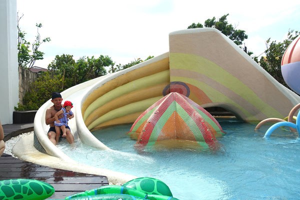 飯店內也有許多遊樂設施,戶外景觀泳池、水療池、兒童戲水池,也有提供可愛大型泳具租借。二樓規劃成親子遊樂專區,有溜滑梯球池、繪本區、桌上手足球台、大人版與小孩版籃球機。這裡還有四間電玩包廂,最多可容納8人,有Xbox、PS4、WII可以選擇。