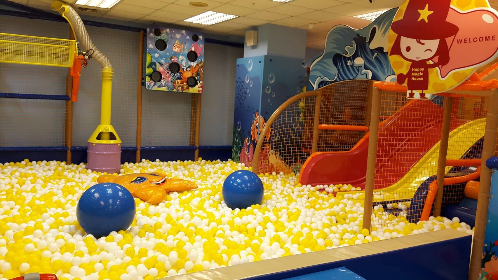 以海洋世界為主題,裡面充滿可愛海洋元素。館內有溜滑梯球池、瀑布球機讓小朋友好興奮。一旁大沙坑上也有個小溜滑梯,攀岩牆上則是一隻一隻可愛的海洋生物。其它還有辦家家酒、可騎乘玩具車、射擊砲...等,還有幼兒爬爬區。