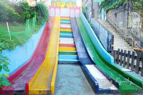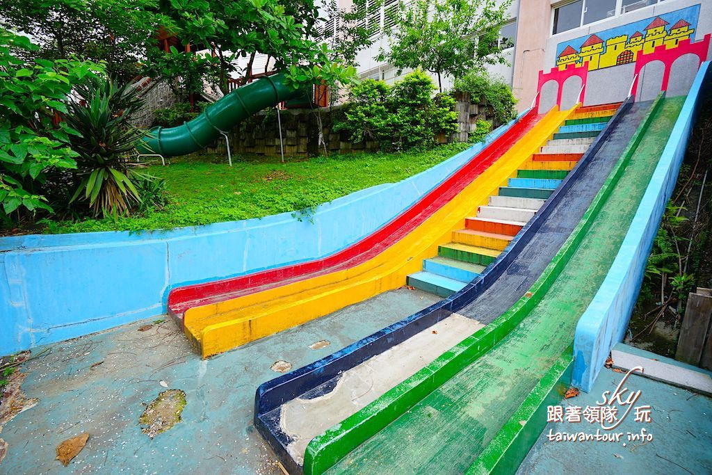 雙溪國小位在台北市士林區,校區依著大崙尾山腰而建,宛若一座森林小學,帶小朋友入內遊玩親近大自然。校園裡共有四座溜滑梯,有近一層樓高的彩色磨石子溜滑梯、體能溜滑梯、大溜滑梯組,還有多種攀爬遊樂設施。