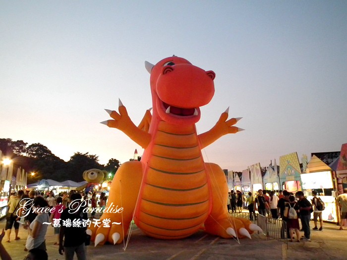 另外夜市內也有彈跳床、套圈圈、彈珠台...等常見小遊戲。還有大型充氣恐龍、小熊與小朋友一起拍照;各式小吃攤販不少,邊吃邊逛好歡樂。