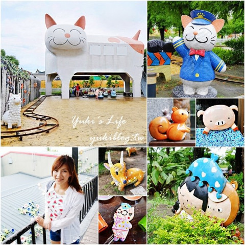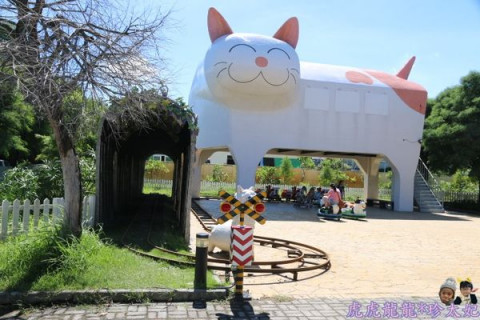 園區內還有一個超可愛的大型貓車站,車站下方是投幣式小火車,一次50元會載著小朋友繞園內後方一圈,途中會經過一個一個可愛的動物交趾陶作品,可以拍出許多好照片。除了小火車,貓車站下方也有一些投幣式的動物車可以讓小朋友玩。