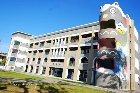 校園內有座龍貓造型建物,以綠色建築為理念打造出兼具節能與美觀的大樓,正面有可愛龍貓造型;背面則是活潑生動的樹屋造型,七彩欄杆讓畫面更亮麗。