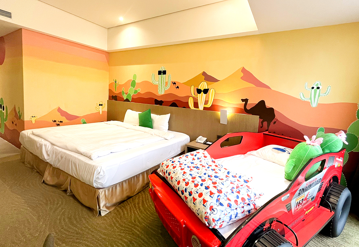 親子房又有不同的主題設計,像是賽車、海底世界、南瓜馬車、小巴士、馬戲團等。