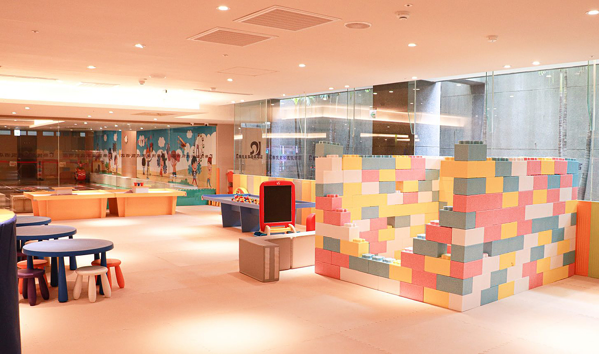 兒童遊戲室位於地下一樓,有積木桌、大積木、搖搖馬、感統遊具等。