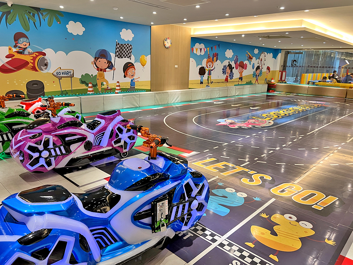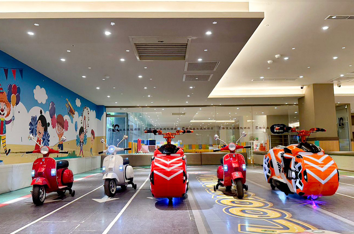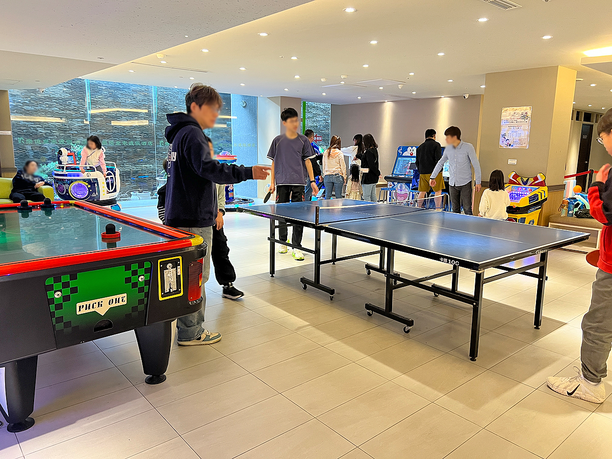 兒童遊戲室位於地下一樓,有積木桌、大積木、感統遊具等,一旁賽車道還有小朋友可以自己開的電動車車;除了遊戲室外,另有書報繪本閱讀區、桌撞球、Switch遊戲機,以及投幣式遊戲機,飯店也有提供腳踏車租借。