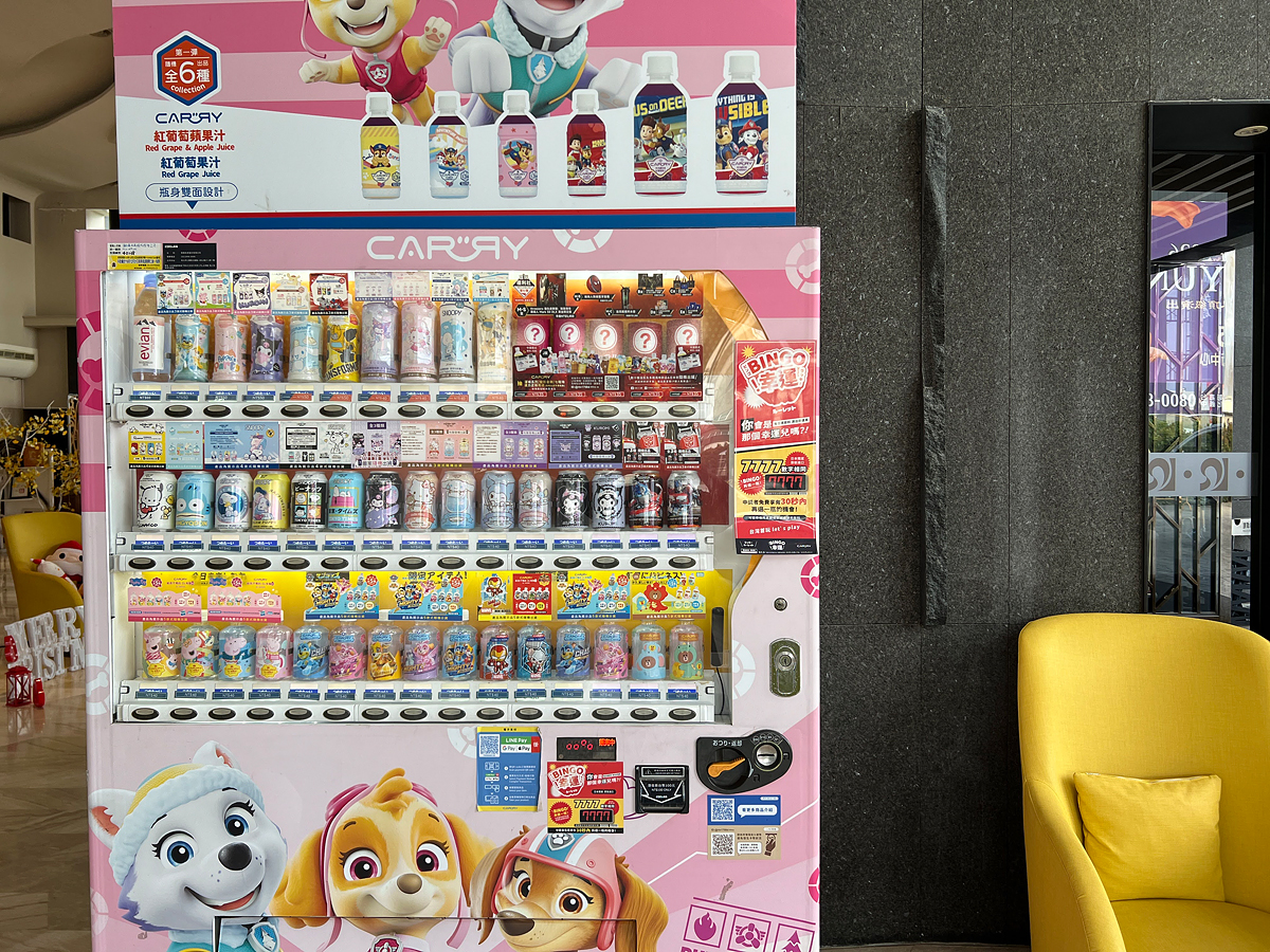 這裡擺放一台可愛的投幣飲料機,吸引小朋友的注意;另外飯店旁有全家、斜對面也有小七,要買小東西很方便。