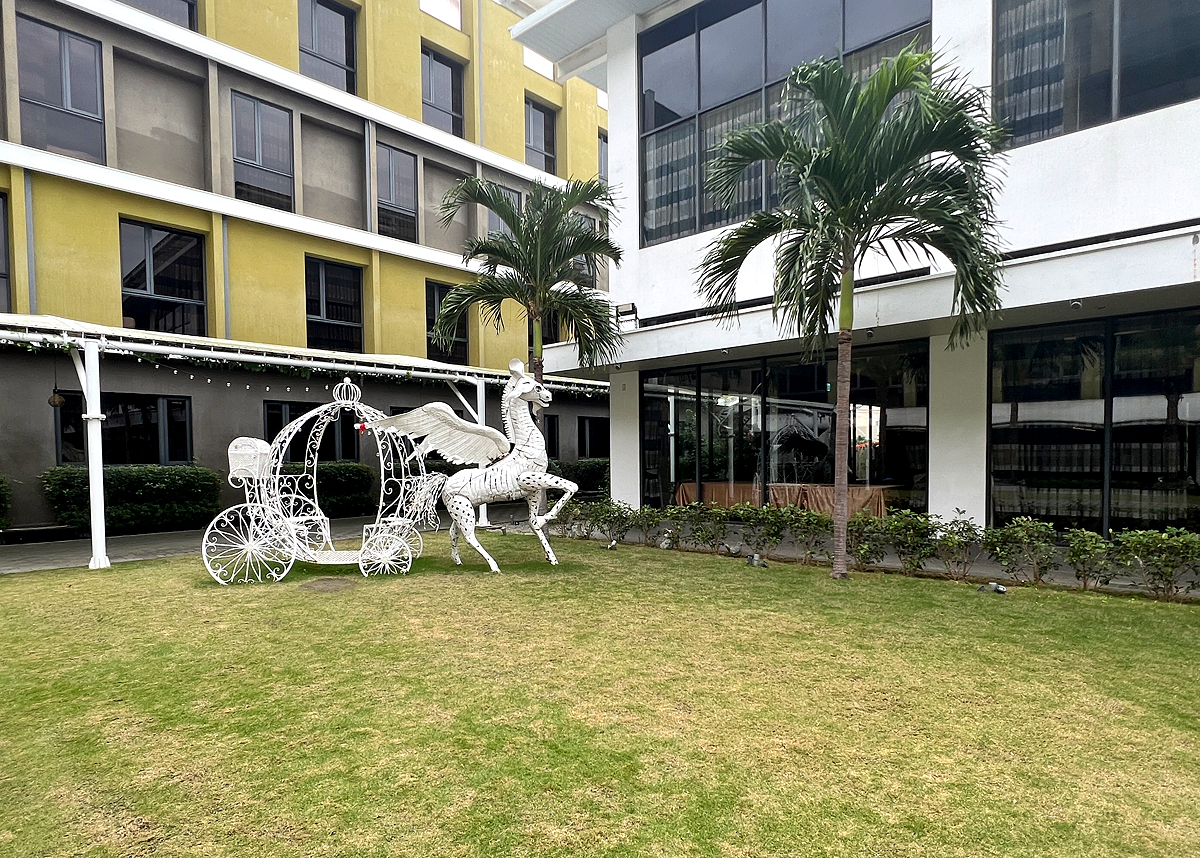 飯店中庭空間不小,有草皮區與純白馬車裝置藝術。