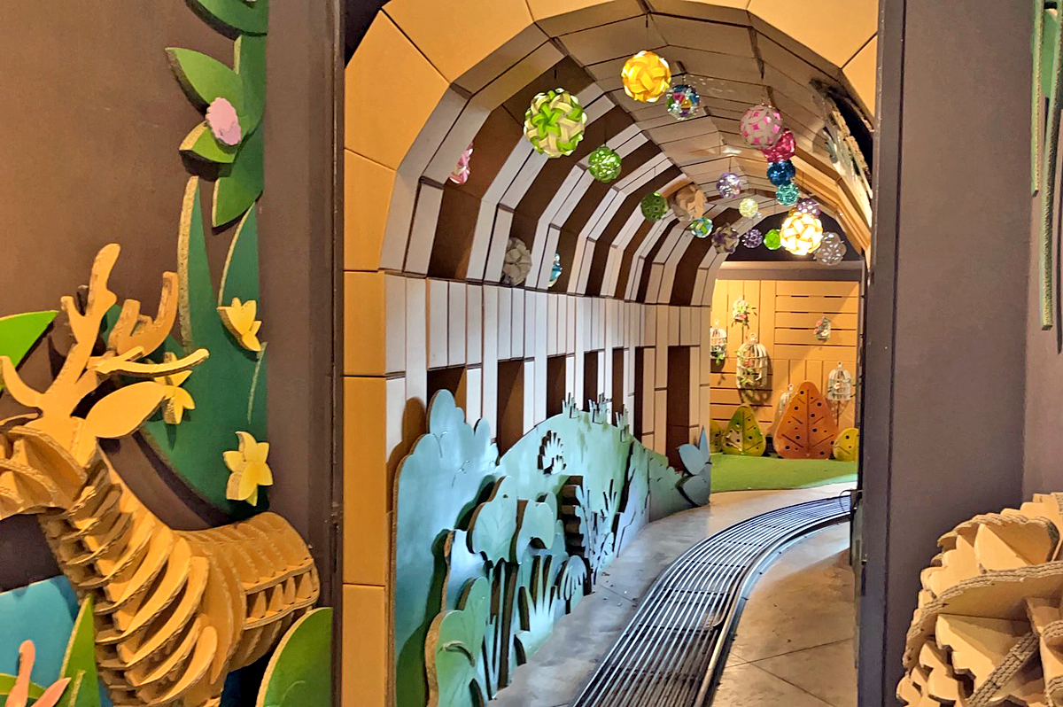 小火車會開到室內,在行駛中還能欣賞紙製的裝置藝術,很有趣。