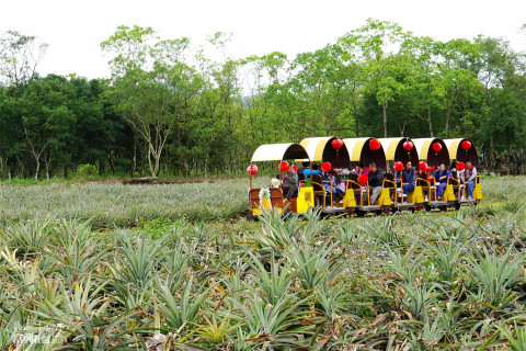 鳯梨小火車是全台第一部綠能輕軌小火車,亮黃色造型在森林裡很醒目,坐著車欣賞林地風景充滿悠閒感。除了輕軌小火車,另外還有由古早大型農機車拉載的小火車,司機還會進行導覽帶大家認識富興村的特色。