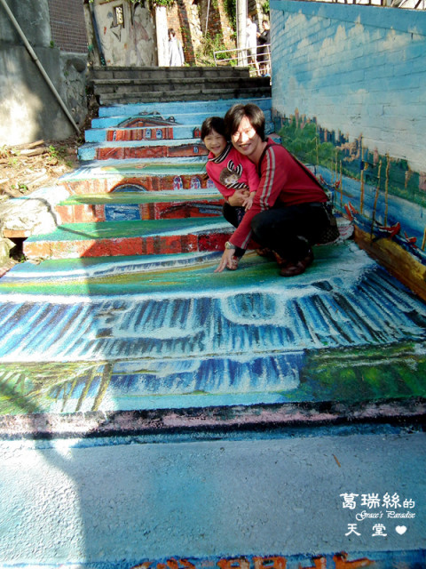 階梯二旁牆面則繪有淡水夕暮、關渡大橋、渡船頭、淡水媽祖、福佑宮等知名景色,彩繪範圍不算大,可與周遭景點一起安排順遊。