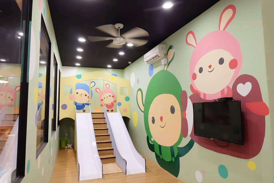兒童遊戲區是一間獨立的空間,小朋友的吵鬧聲不會直接影響到用餐區,大片的透明玻璃方便爸媽觀看小朋友的狀態。裡面擺放滑步車、童書與一些益智玩具,牆上還有電視可以看。2017年底新增二樓用餐區,且在二樓設置溜滑梯遊戲區,小朋友能玩的更多了。