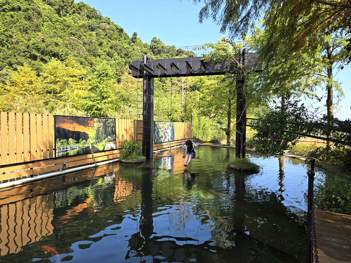 另外一個超受歡迎的絕美景點就是水上鞦韆,藍天白雲下在水上輕輕的擺盪著,腳下還不時有許多漂亮的鯉魚游過。